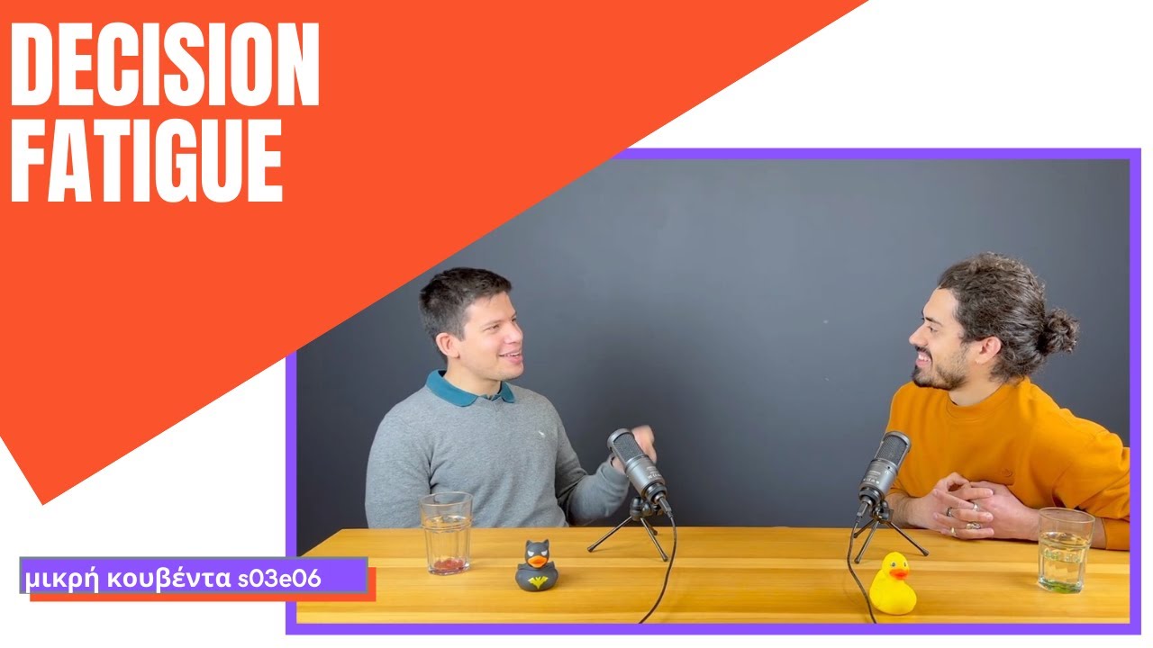 Αυτή την εβδομάδα συζητάμε για decision fatigue, ή την κόπωση λήψης αποφάσεων στα Ελληνικά. Αναλύουμε το πόσο μας κουράζει ή όχι η λήψη αποφάσεων γενικά, μερικές ιδέες για το πώς μπορούμε να μειώσουμε τις αποφάσεις που παίρνουμε, είτε σε ατομικό, είτε σε ομαδικό επίπεδο και πότε έχει νόημα να αναλωνόμαστε σε αυτή ή όχι.